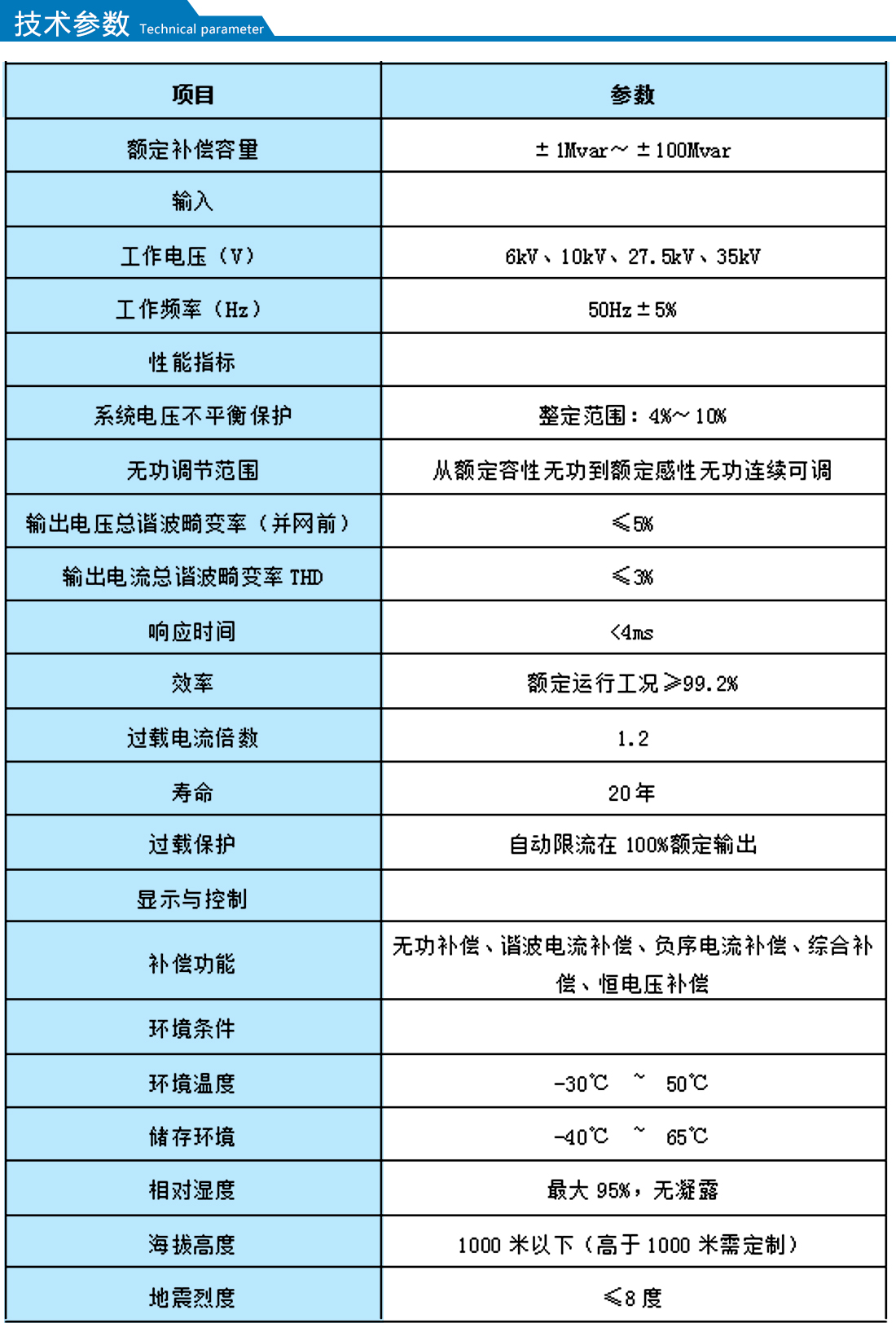 【額定補償容量】:±1Mvar~±100Mvar      【工作電壓】:6kv 、10kv、27.5kv、35kv